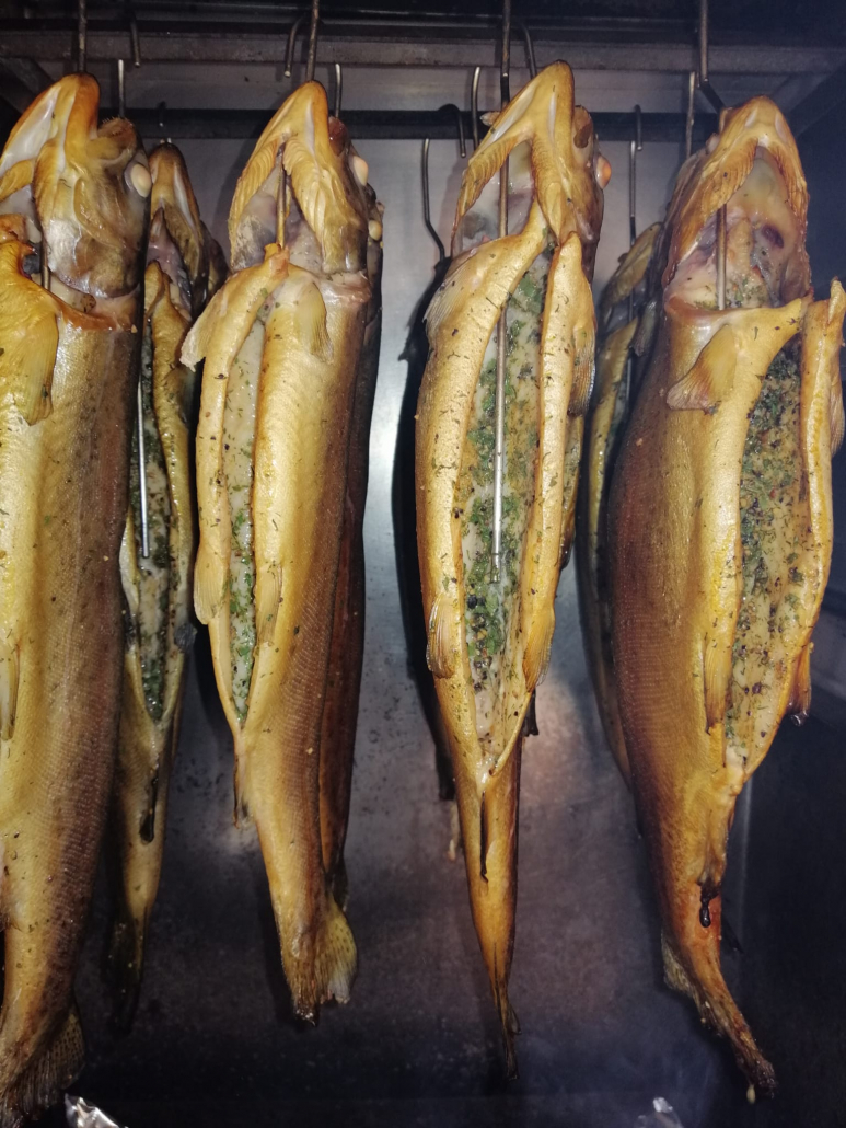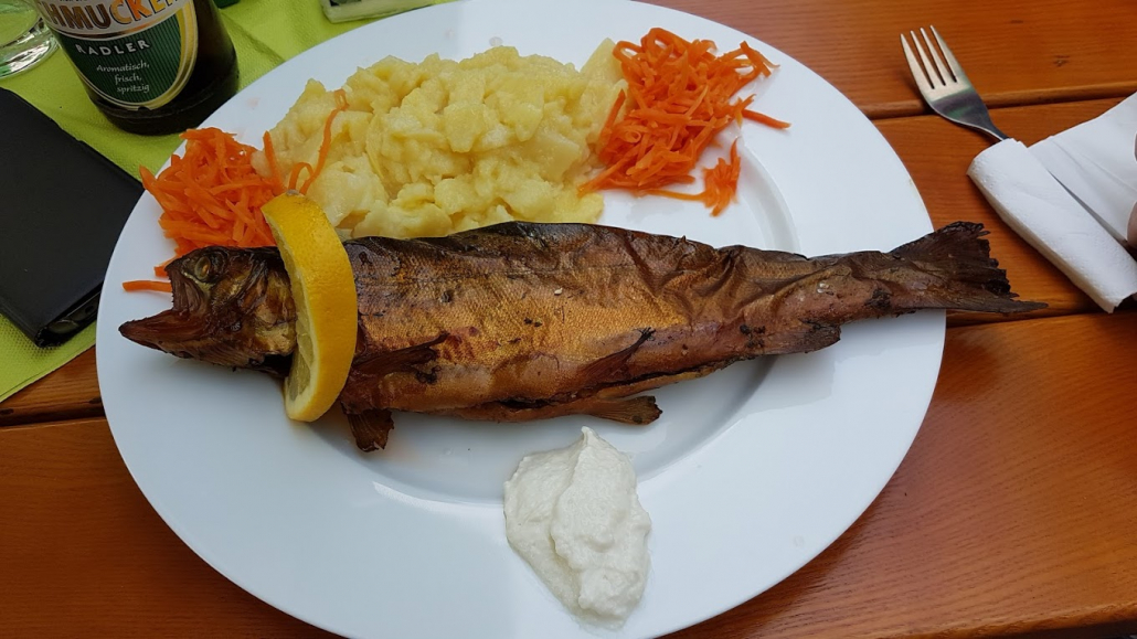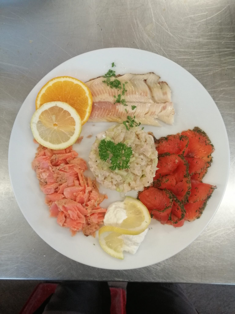 - Geräuchertes Forellenfilet (warm) mit Beilage